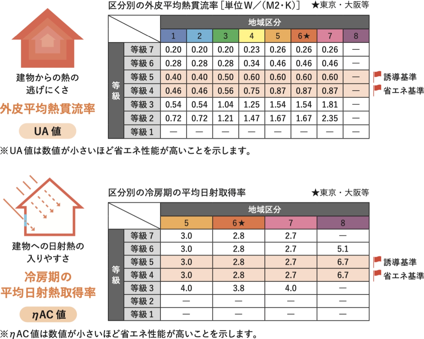 外皮の熱性能基準には、断熱性能を示す「外皮平均熱貫流率UA」と日射遮蔽性能を示す「冷房期の平均日射熱取得率 ηAC」があります。建設地の地域区分により基準値が定められており、その基準値以下になるよう求められています。